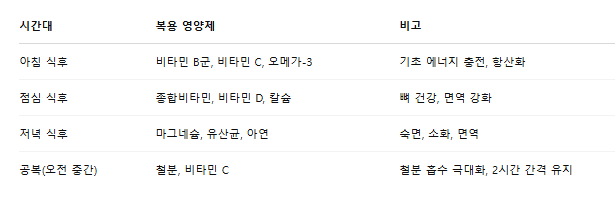 영양제를 먹는 ‘시간’은 그 흡수율과 효과에 큰 영향을 미칩니다. 특히 수용성/지용성 여부, 공복/식후 여부, 복용 간격, 그리고 특정 성분 간 상호작용 등을 고려해야 합니다.