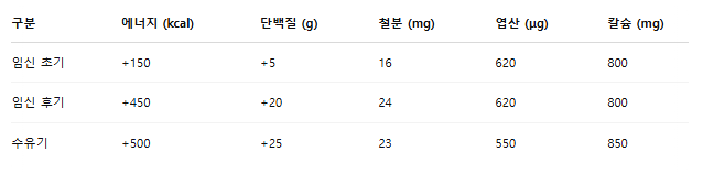 아기를 키우는 몸이기 때문에 대부분의 영양소 필요량이 급격히 증가해요. 특히 철분, 엽산, 칼슘, 단백질은 꼭 신경 써야 해요.